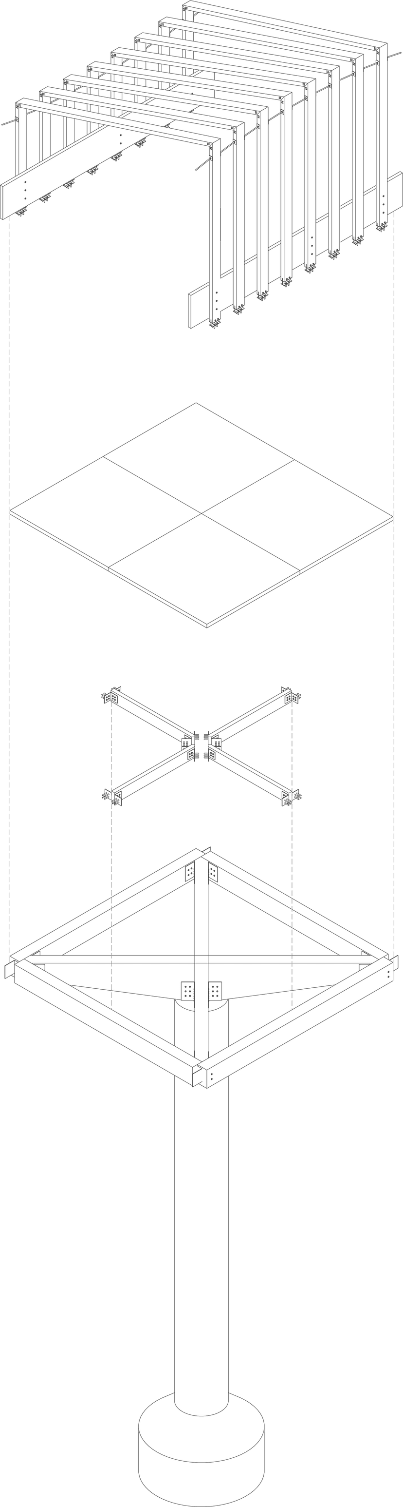 For its construction, glued laminated timber (GLT) was used, a structural material produced by bonding individual wood segments with industrial adhesives, as well as concrete for the foundation pillar measuring 1.20m x 2.80m in diameter. Finally, metal components were used for all connections, from 8mm-thick steel plates to steel cables fastening the frames together.